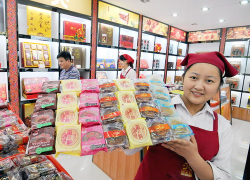 9月4日,在开发区一家食品店里,工作人员在展示刚摆上柜台的月饼。中秋节将至,我市众商家也纷纷瞄准月饼市场,新一轮的“月饼大战”已悄然拉开了帷幕。