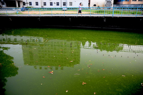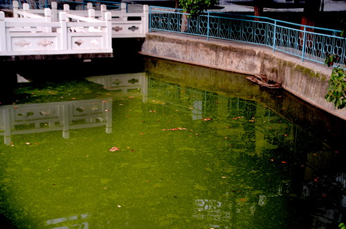 时下,安庆城区一些单位建造的水体景观,由于水面较小,水体没有自净能力,加上没有换水设施,又缺乏管理,致使微生物大量繁殖,水面垃圾漂浮,水质恶化,散发异味。图为一家医院内的水池,已变成了绿色染缸、蚊蝇滋生之地。有市民建议,对城区的水池、水塘,也应尽快实行“门前三包”,为居民营造一个整洁的生活环境。
