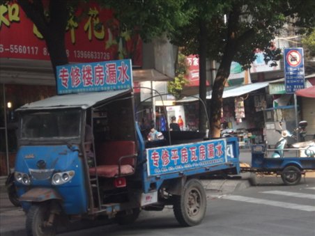 图为沿途停靠的“专修楼房漏水”三轮车