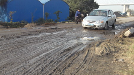 记者在现场看到,就在这块禁行牌下,不到十分钟的时间,就有5辆大型重载货车和一些超载车辆从这里经过。记者从沿江大堤防汛道路上行走着,看到路面坑坑洼洼,有的地段已经泥泞不堪,有的路面出现大块开裂,还有的路面上石料被挤在了一起。