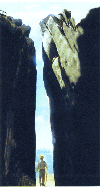 天柱峰下,有一峰与主峰裂有一缝,如巨斧劈开一般,下不着地,俗称小天门,又称“一线天”。峰高不过10米,如一初开的花朵,因而峰名“花峰”。仰望天柱峰的石壁上,有楷体横书“顶天立地”四个大字。这是民国廿九年,国民党将领刘义纯题写的。 | ||