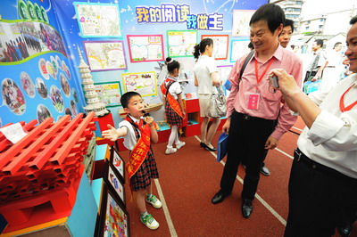 市小学教育管理创新与校本文化建设特色成果展演于5月8日至9日在迎江区各小学举行,构建高品位的校园文化,树立“为了每一个孩子的发展”的教育理念成为每个校园展区夺目的亮点。 图为学生讲解员向人们展示孩子们自己研制的科技成果。 |