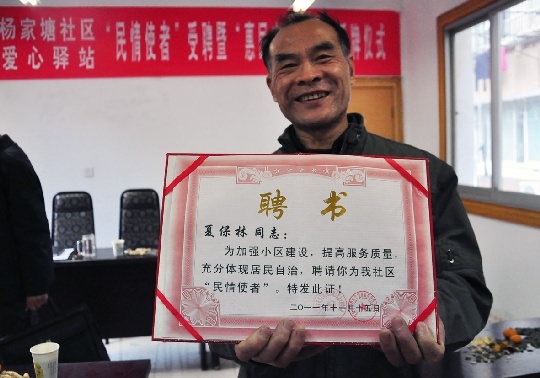 图为社区居民夏保林向记者展示他的“民情使者”聘书。徐火炬 摄