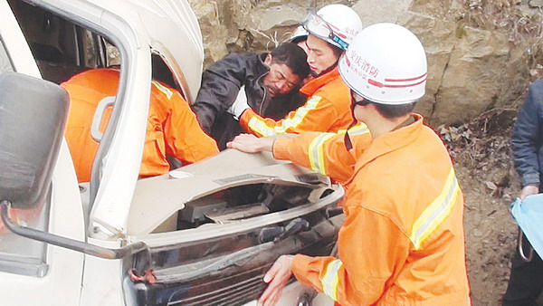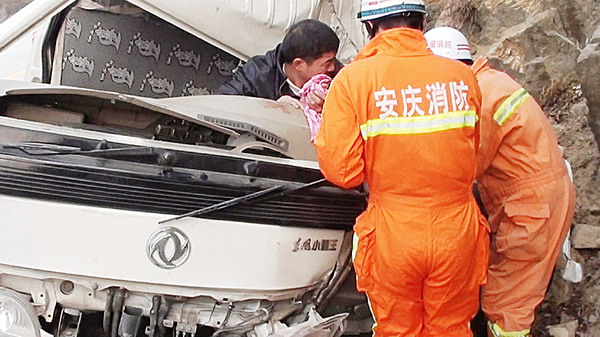 1月2日下午,岳西县明堂山风景区附近的318国道669段处发生一起交通事故,一辆小货车因车胎爆裂,在撞上国道旁的山壁后,车身脱离路基,驾驶员被困;由于山壁上岩石松动,随时有落下山石的危险。