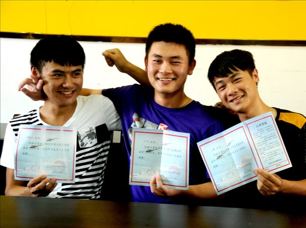 图为吴德兵(左)、王刚(中)、王康(右)拿到录取通知书后笑容满面,意气风发。徐勇进 摄