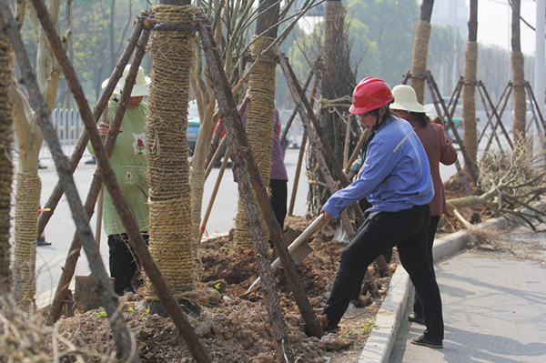 图为菱湖北路工作人员正在栽种树木。今春安庆市中心城区道路绿化工程(第一批)正在对市区包括皖江大道、菱湖南路等路段在内的11条道路进行绿化提升。
