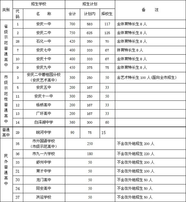 我市今年继续在部分省、市示范高中选招艺术、体育等方面有特长的考生。从公布的《安庆市区2014年普通高中招生计划表》可以看到,市区六所省示范高中都招收体育特长生,每所学校限招8人,安庆二中碧桂园分校招收100名艺术特长生。