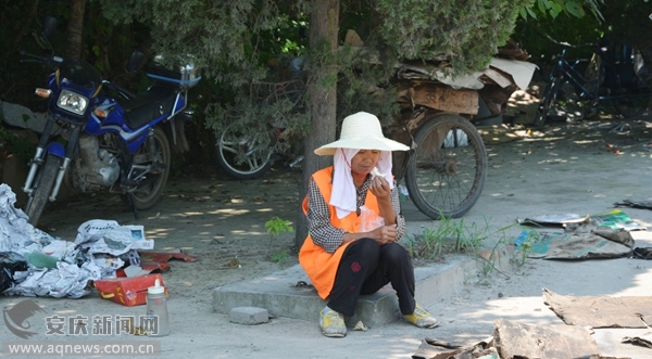 7月31日,中午12点左右,安庆晚报记者在集贤北路独秀园附近见到58岁的环卫工王大姐时,她刚刚打扫完道路,正坐在路边准备吃午饭,头上用于擦汗遮阳的毛巾早已经湿透了。根据当日公布的气象资料显示,户外气温已达到39℃到40℃。如此高温天,记者站着不动都一身是汗,但是王大姐一身长衣长裤披着长马甲。