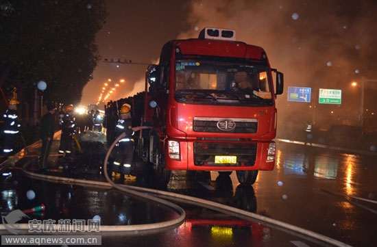 1月20日晚20时47分,一辆满载冰箱压缩机的重型半挂牵引车,从江西景德镇开往合肥方向,途经沪渝高速524km安庆长江公路大桥时,司机通过后视镜发现货厢起火,于是将车停下,在采取简单处理措施无果后,考虑前方不过2公里就是收费站,司机冒险将燃烧的货车开出收费站,闻讯赶来的安庆高速交警三大队、城区交警二大队、安庆消防官兵,经过20分钟的紧急施救,将火扑灭。