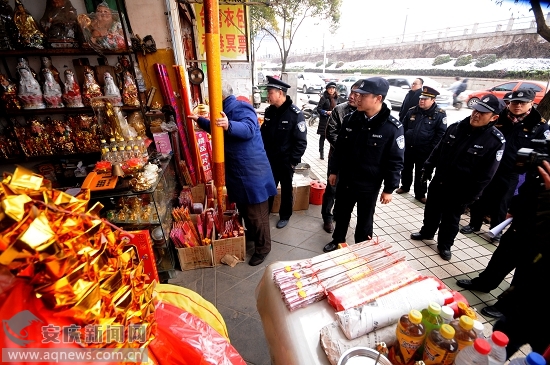 为切实加强迎江寺除夕敬香祈福安保工作,2月1日,市公安、安监、工商质检等部门对迎江寺周边烟花爆竹和香烛经营店进行了一次“地毯式”排查。行动中,执法部门除检查各烟花爆竹、香烛店是否有经营许可证、是否有安全管理措施,还重点对各单位是否存在“三合一”现象、是否配备必要的消防器材等进行了细致排查。检查组沿街抽查了多家店铺,大部分单位都能按照规范要求,加强烟花爆竹、香烛的分类存放。然而,在沿江路一家香烛经营店,检查组发现这家经营店店主在没有烟花爆竹经营许可证的情况下,公然销售烟花爆竹,对这一违法行为,检查组当即叫停,并当场责令改正。